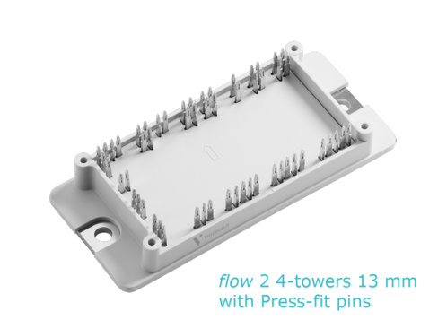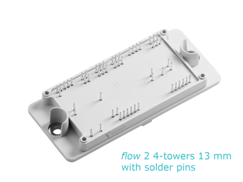 The flow 2 module consists of a copper baseplate that reduces thermal resistance and junction temperature to extend components' service life. The baseplate also allows to assemble different sizes of DCBs fitting for all considerable topologies. All modules are available with solder or Press-fit pins.