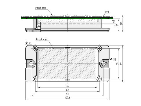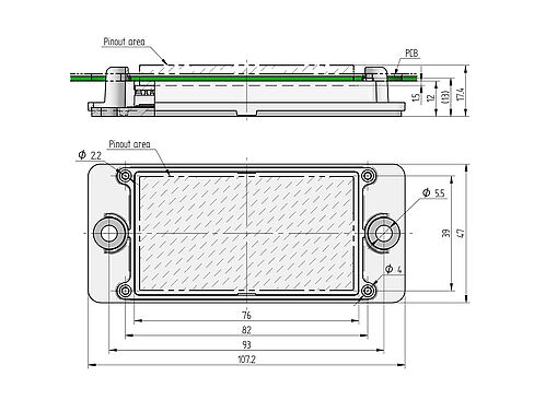 Like all flow modules, its pins may be positioned freely to shorten bond wires inside the module, thereby achieving low stray inductance and, ultimately, low voltage overshoot during turn-off.Housing dimensions